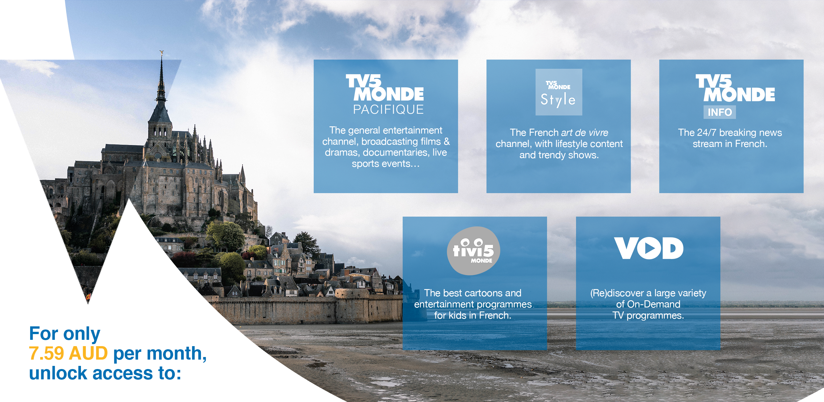 TV5MONDE is the world’s general entertainment TV network in French. You can now access its full offer by subscribing to the TV5MONDE